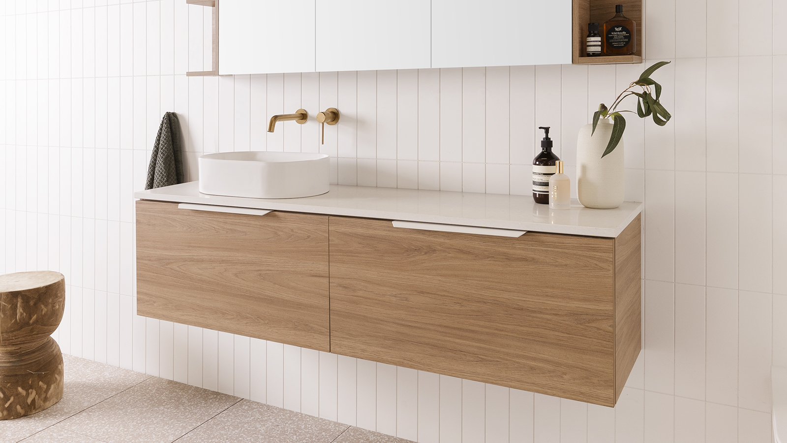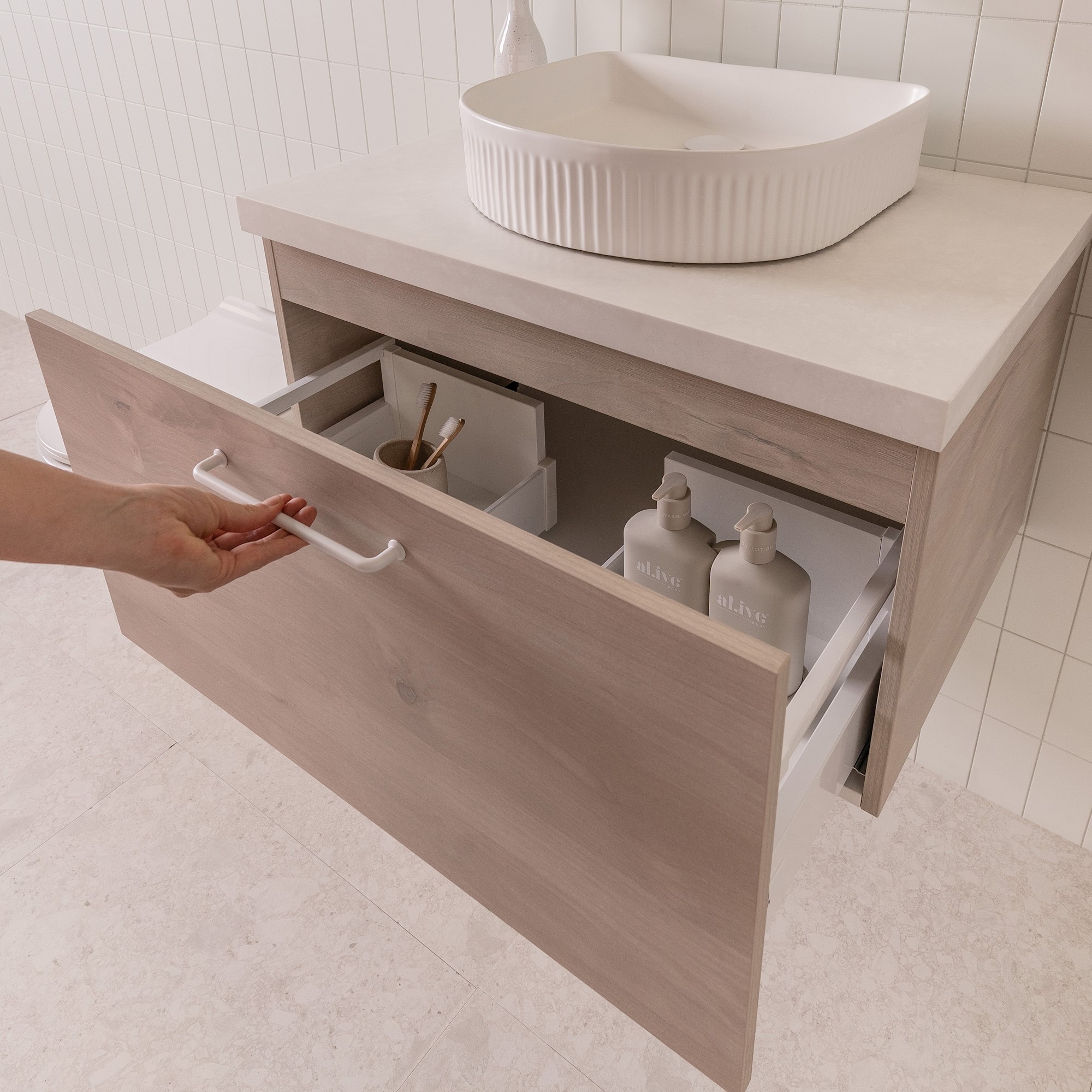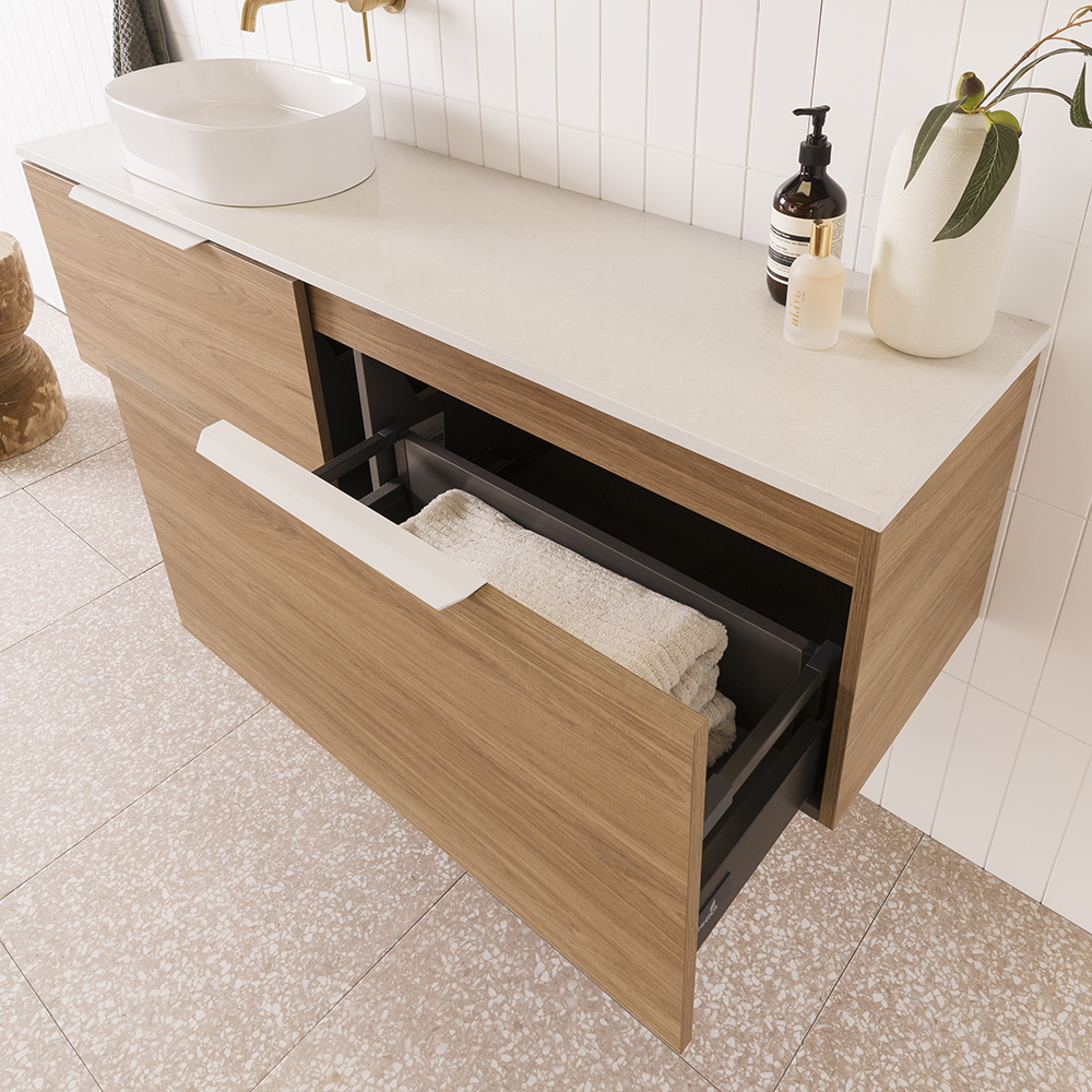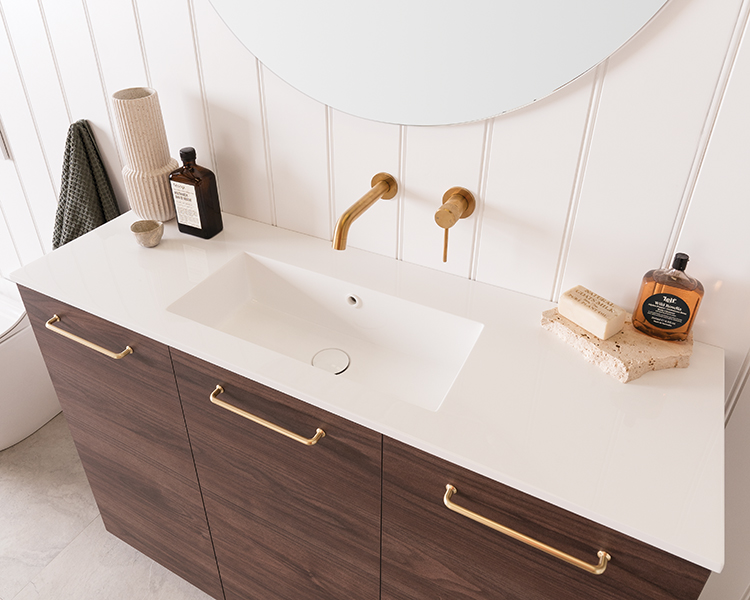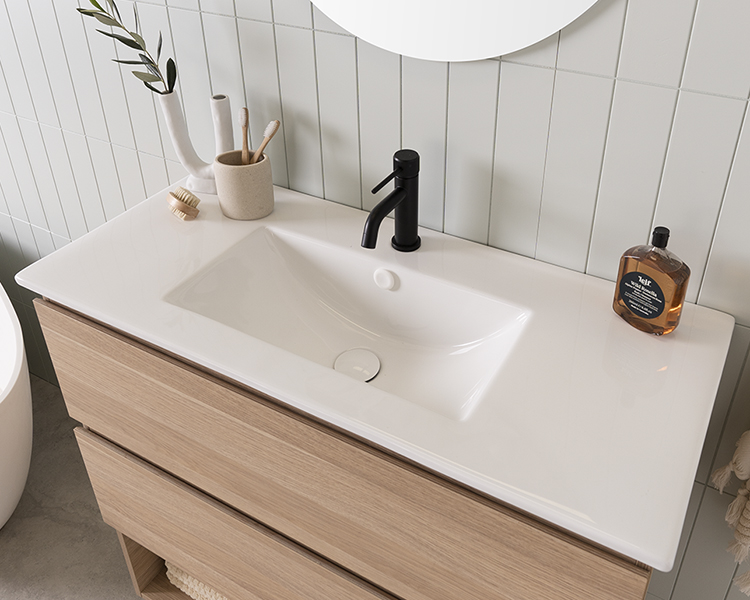 Choose from Ceramic or Cast Marble moulded tops (0, 1 or 3 tap hole available) or benchtop options.