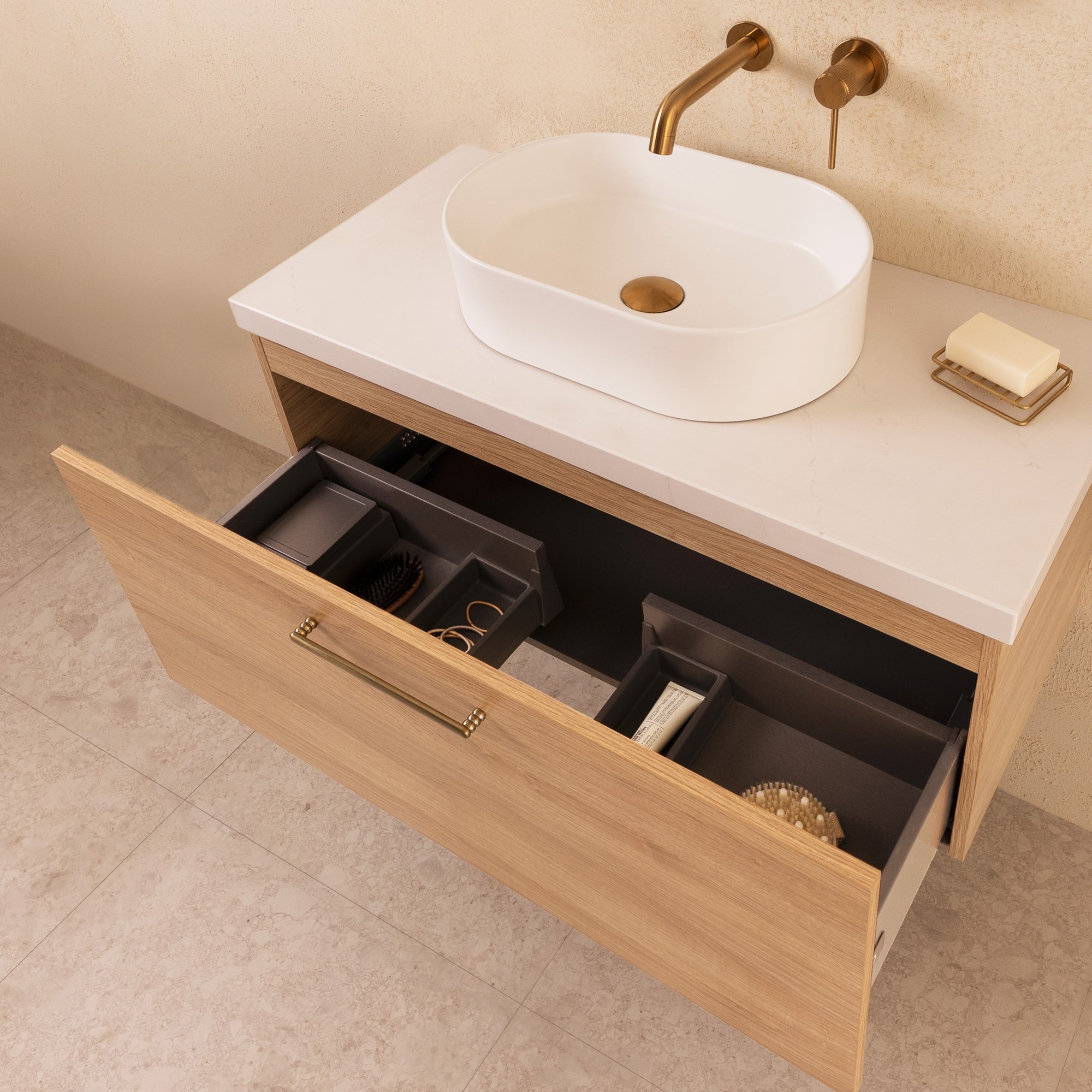 Choose from Ceramic or Cast Marble moulded tops (0, 1 or 3 tap hole available) or benchtop options*.