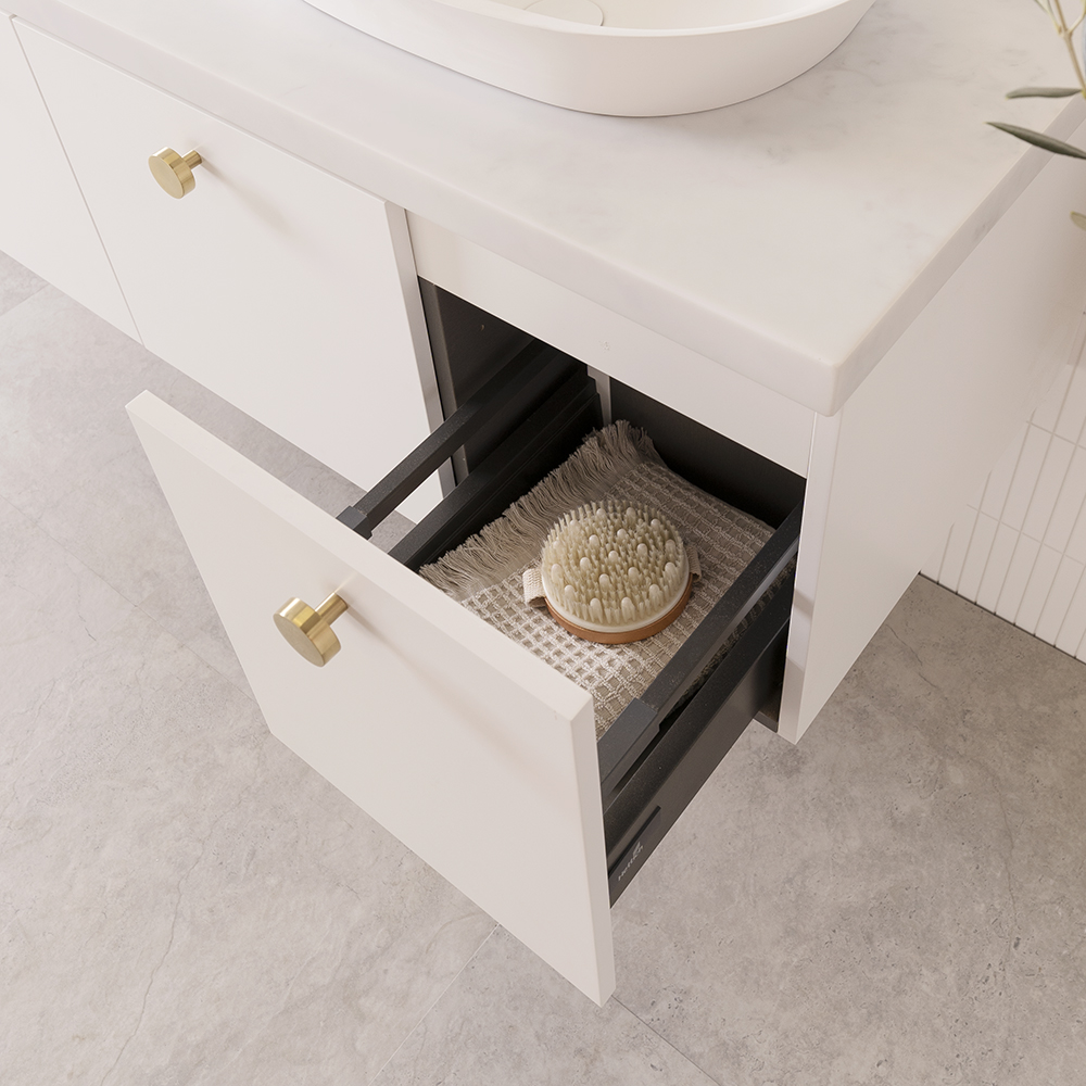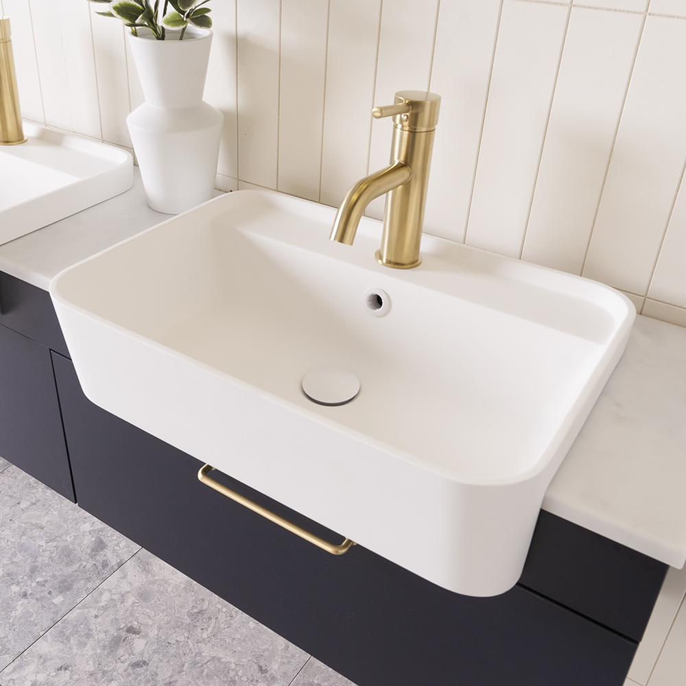 Choose from Cast Marble moulded top (0, 1 or 3 tap hole available) or 12/20mm benchtop options (no extra charge for basin and tap hole cut-out).