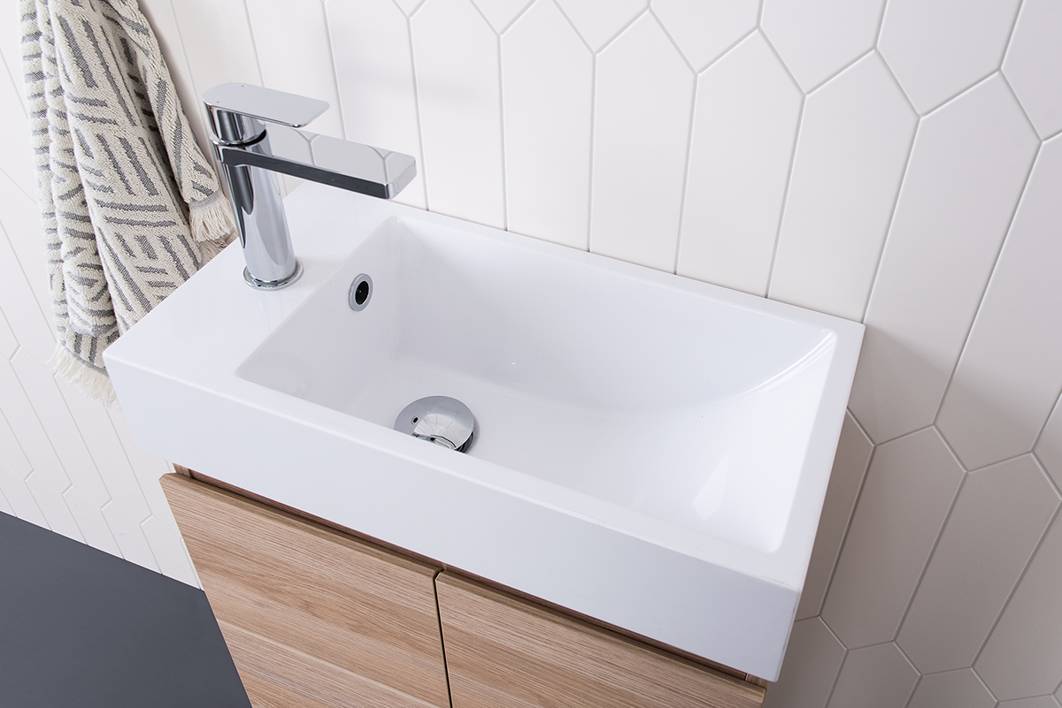 Cast marble top 500 (W) x 250 (D) x 100mm (H). 4L basin capacity to overflow.