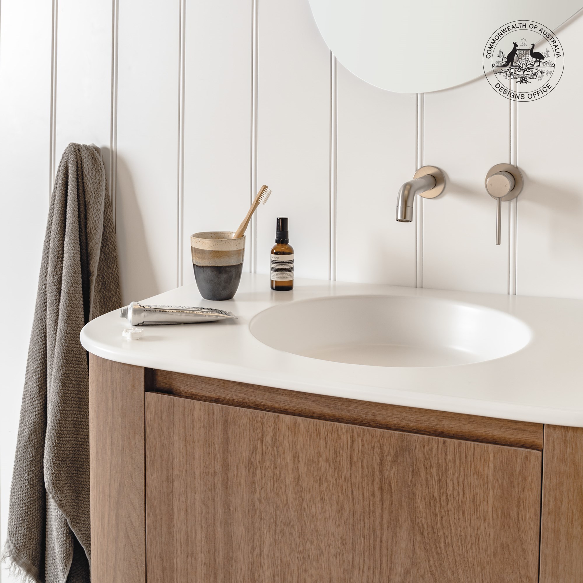 Imperial: Moulded top with fluted edge detailing, fabricated from Durasein Solid Surface. Integrated matte white basin with overflow, positioned in the front of the bowl. 0 tap hole only, can be drilled onsite. Available in Blossoming & Sakal Durasein only.
