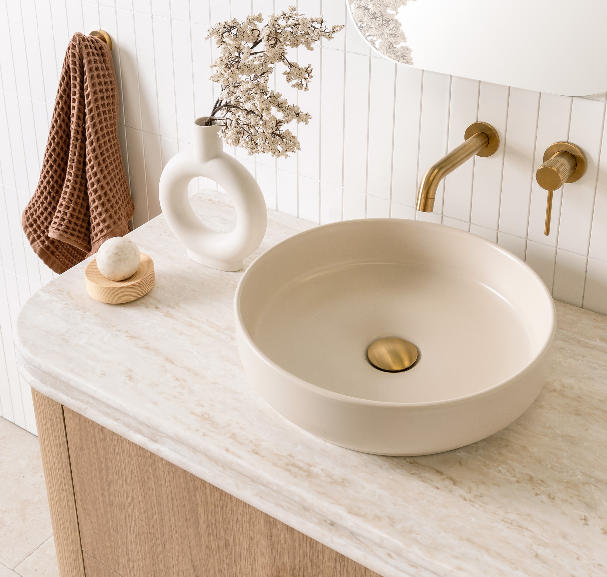 Matte Ceramic: Curved ceramic moulded top in matte finish, featuring an integrated overflow positioned in the front of the bowl. Tap hole available as 10 or 2 o’clock position or 0 tap hole (for wall taps).