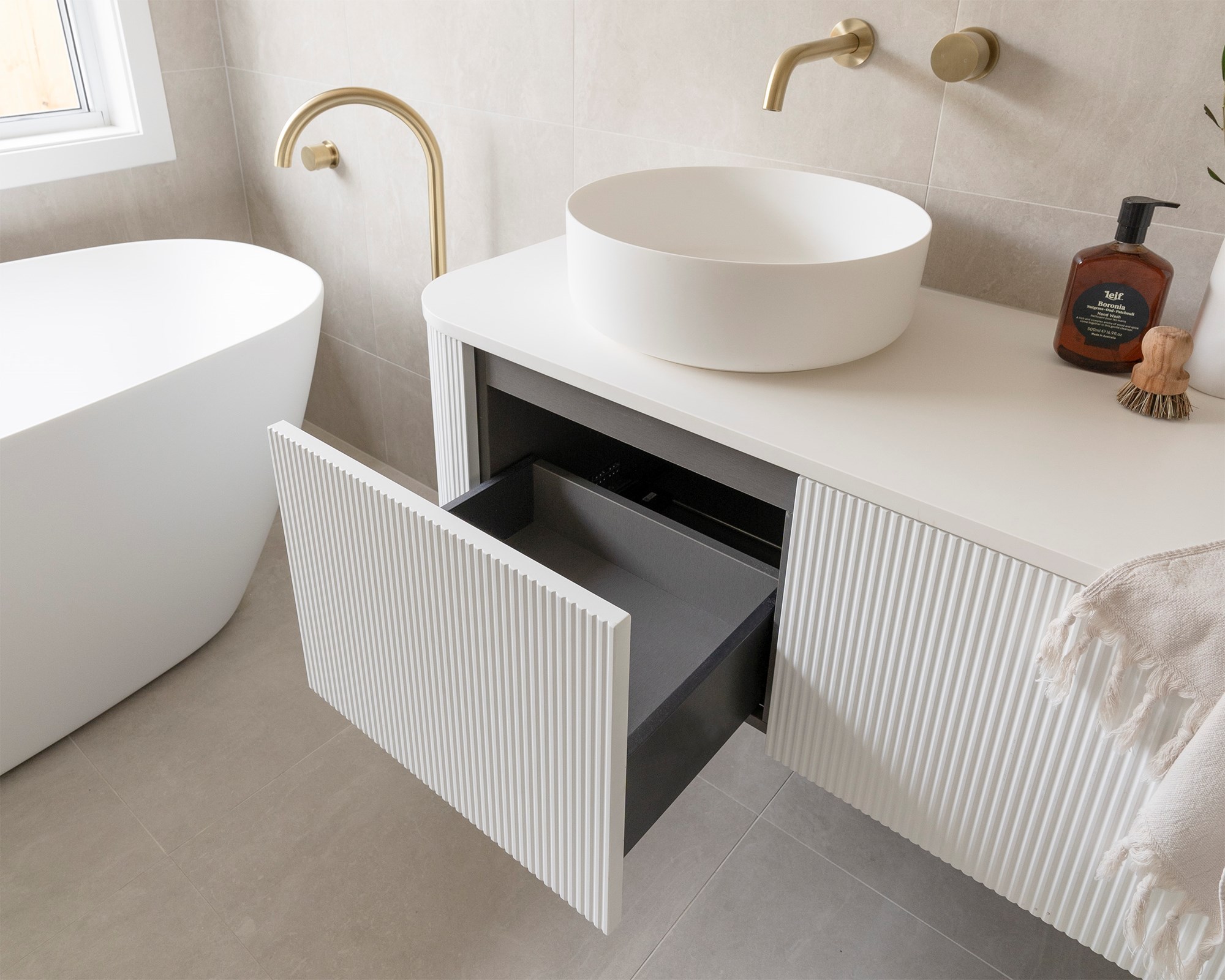 Choose from all benchtop options: 12mm Durasein, 20mm Cherry Pie & 20mm Caesarstone. Upgrade to Statement or Royale benchtop available, Durasein only, surcharge applies.