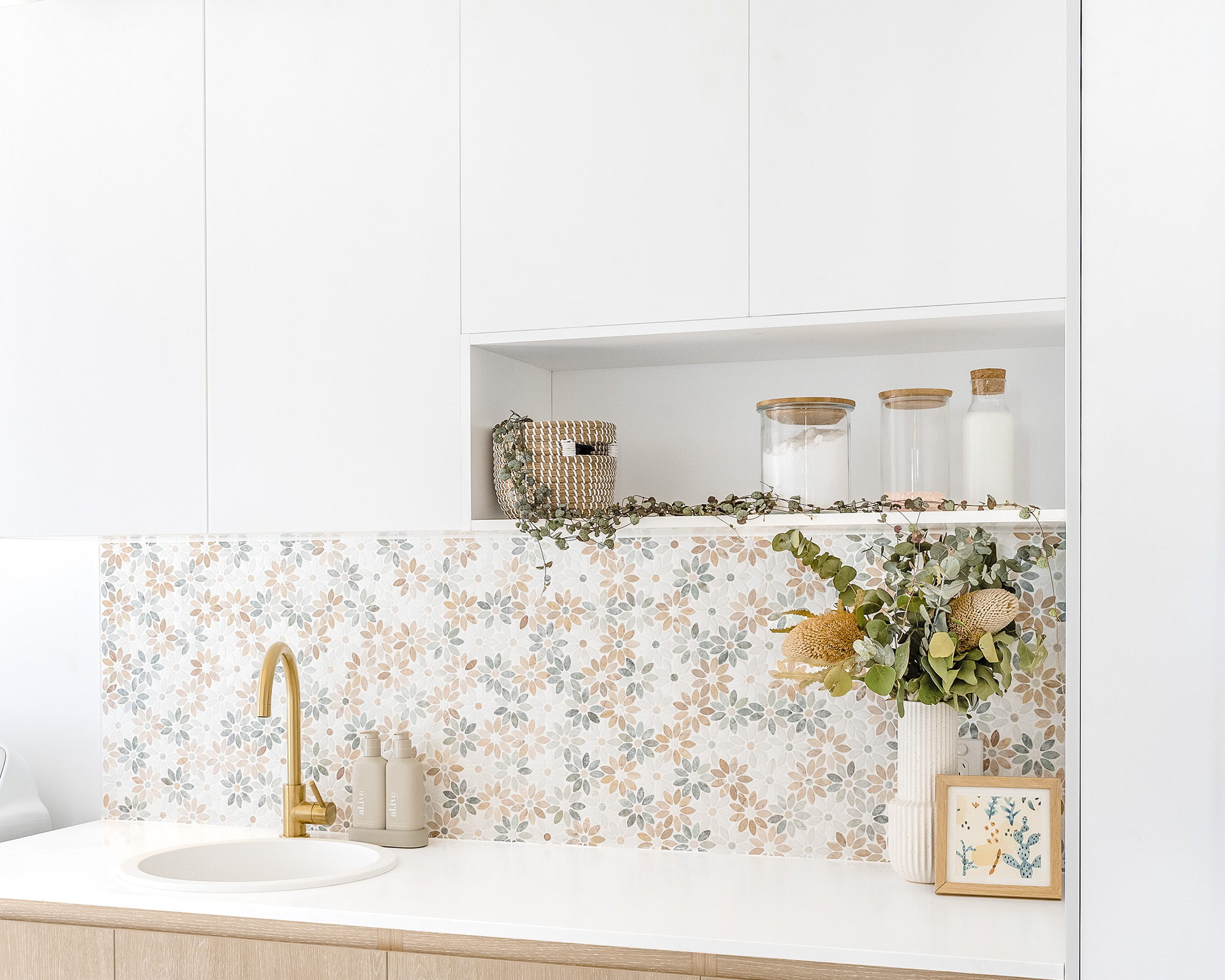 Coastal Oak Woodmatt Floor cabinets with bevel-grip finger pull with 20mm Bright White Cherry Pie benchtop